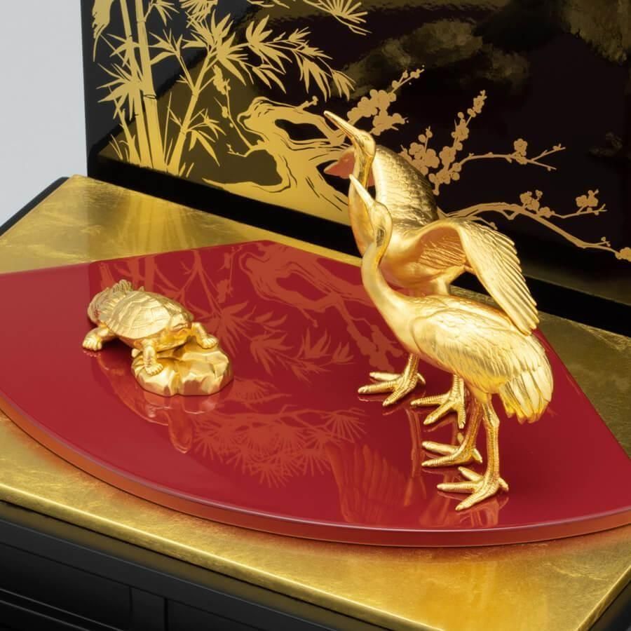 「鶴」は声が高く響くため、天にいる神様まで声を届けることができるといわれ、ありがたい鳥とされ、夫婦で大変仲が良く一生を添い遂げることが夫婦円満の象徴です。