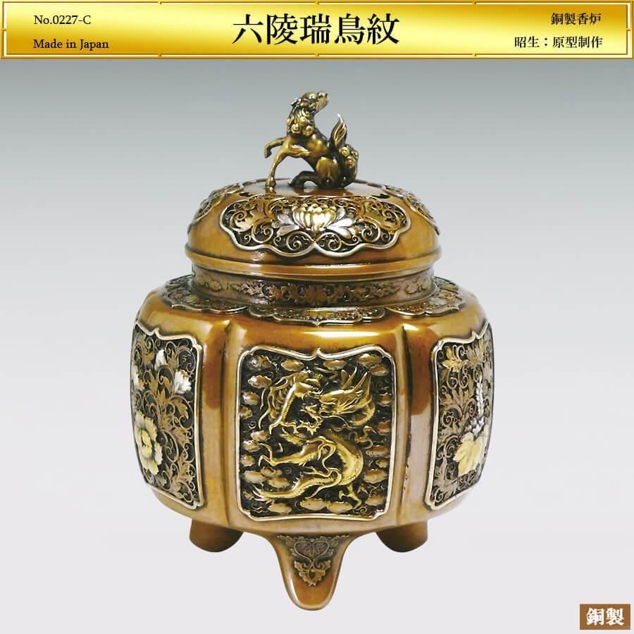 六陵 瑞鳥紋香炉 H16cm|銅製・煮色差しメッキ|昭生:原型制作